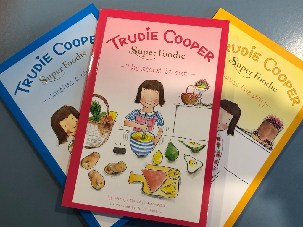 The first three books in Carolyn’s first chapter book series Trudie Cooker Super Foodie have been released! It’s a series that centres around Trudie Cooper, a young cookery genius who uses her super skill to solve problems. Aimed at children 7-9 years, each book contains a child-friendly recipe and colour illustrations by Julia Weston.